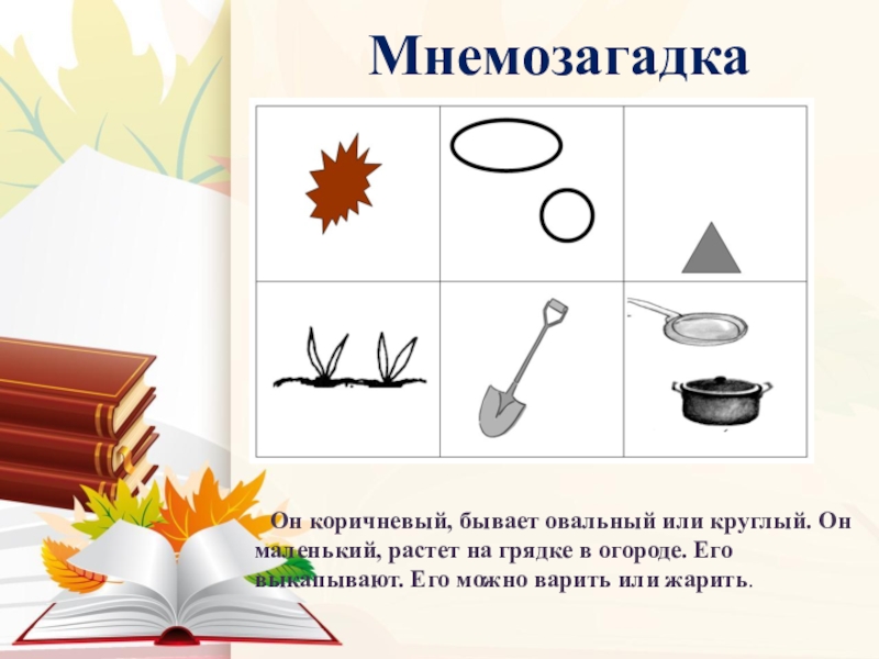 Мнемозагадка    Он коричневый, бывает овальный или круглый. Он маленький,