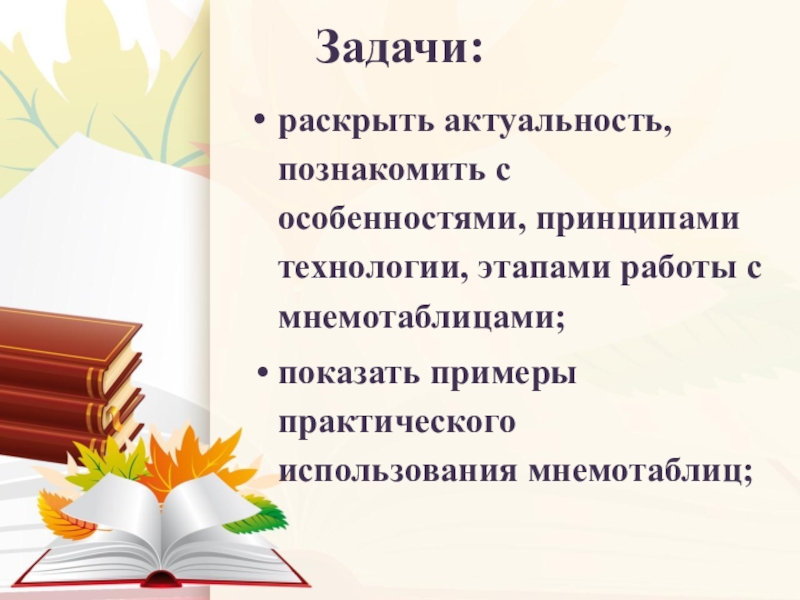 Слайд 4раскрыть актуальность, познакомить с особенностями, принципами технологии, этапами работы с мнемотаблицами;