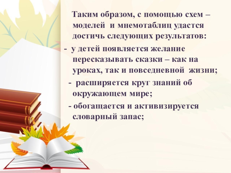 Таким образом, с помощью схем – моделей и мнемотаблиц удастся достичь следующих результатов:- у детей