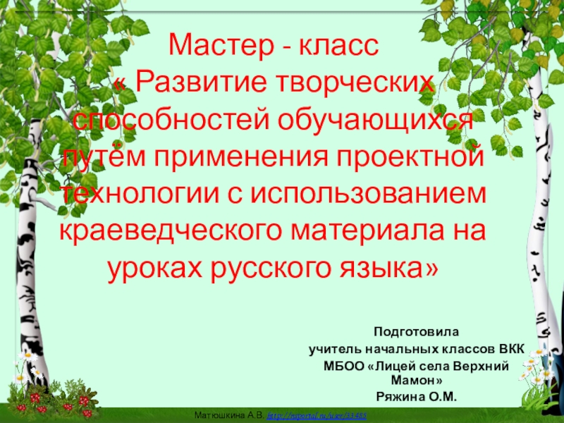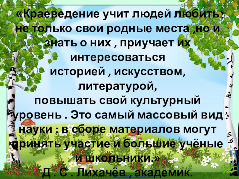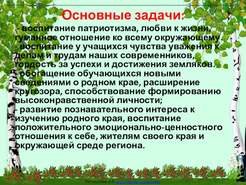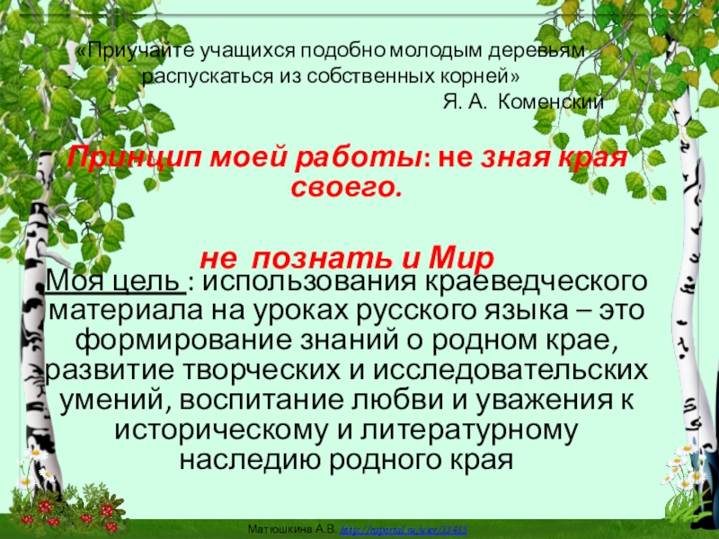 Моя цель : использования краеведческого материала на уроках русского языка – это формирование знаний о родном крае, развитие творческих и исследовательских умений, воспитание любви и уважения к историческому и литературному наследию родного края