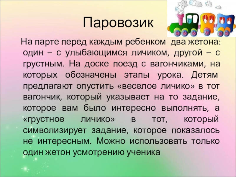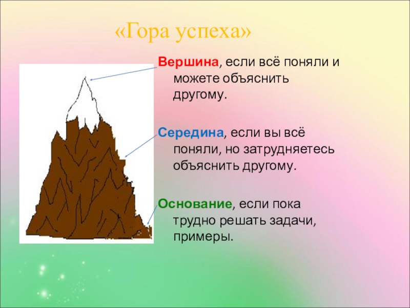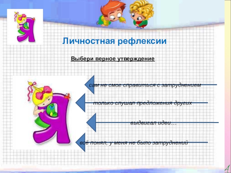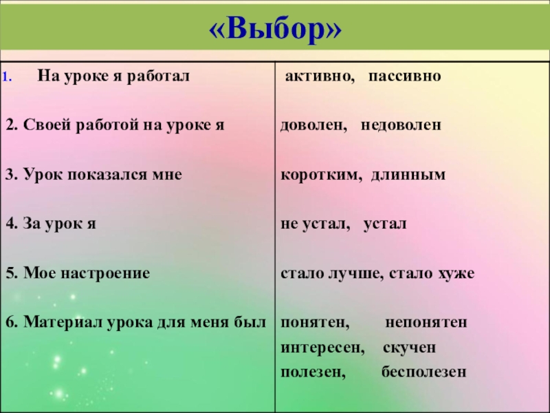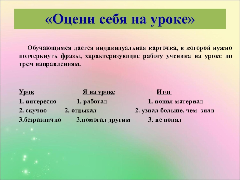 ученика, а ученик, анализируя, осознаёт свои возможности, сам делает свой собственный выбор, определяет меру активности и ответственности в своей деятельности.