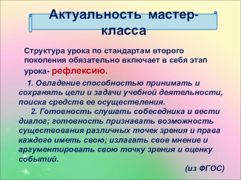 Структура урока по стандартам второго поколения обязательно включает в себя этап урока- рефлексию.