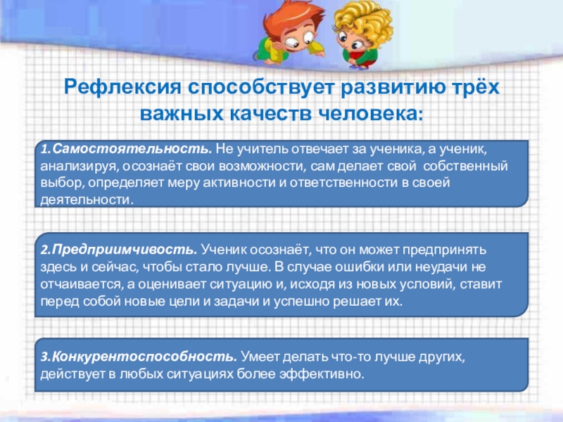 2.Предприимчивость. Ученик осознаёт, что он может предпринять здесь и сейчас, чтобы стало лучше. В случае ошибки или неудачи не отчаивается, а оценивает ситуацию и, исходя из новых условий, ставит перед собой новые цели и задачи и успешно решает их.