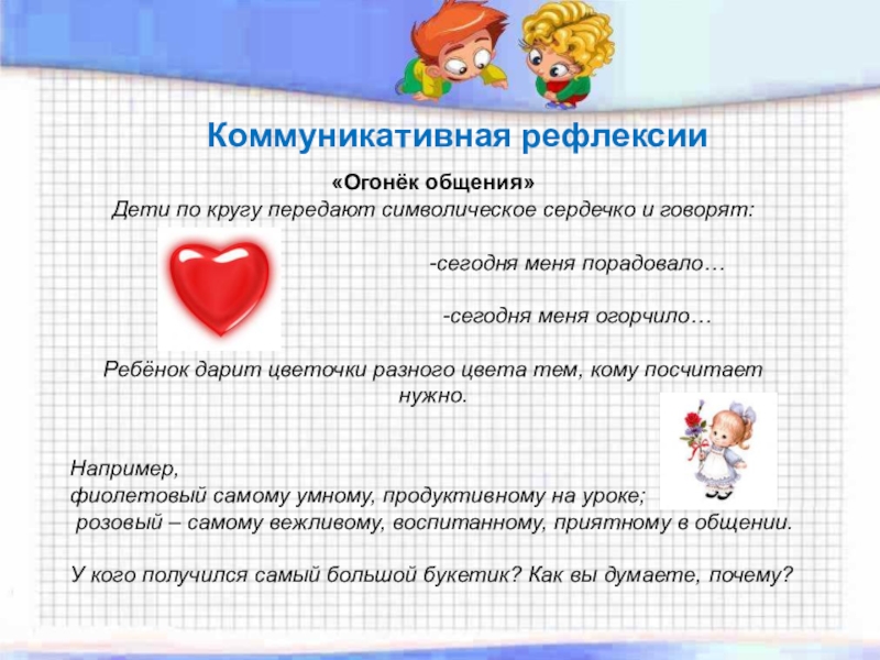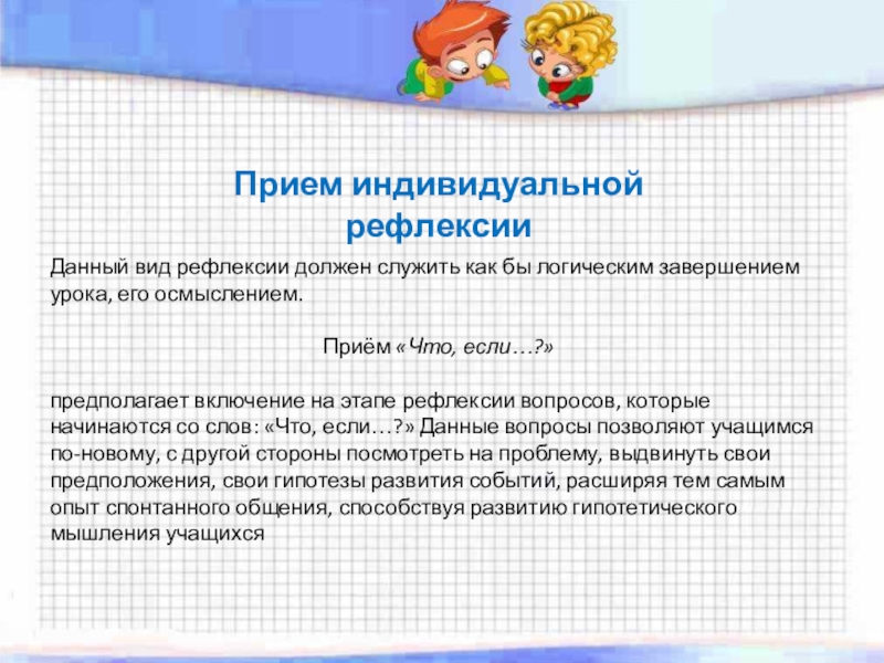 предполагает включение на этапе рефлексии вопросов, которые начинаются со слов: «Что, если…?» Данные вопросы позволяют учащимся по-новому, с другой стороны посмотреть на проблему, выдвинуть свои предположения, свои гипотезы развития событий, расширяя тем самым опыт спонтанного общения, способствуя развитию гипотетического мышления учащихся