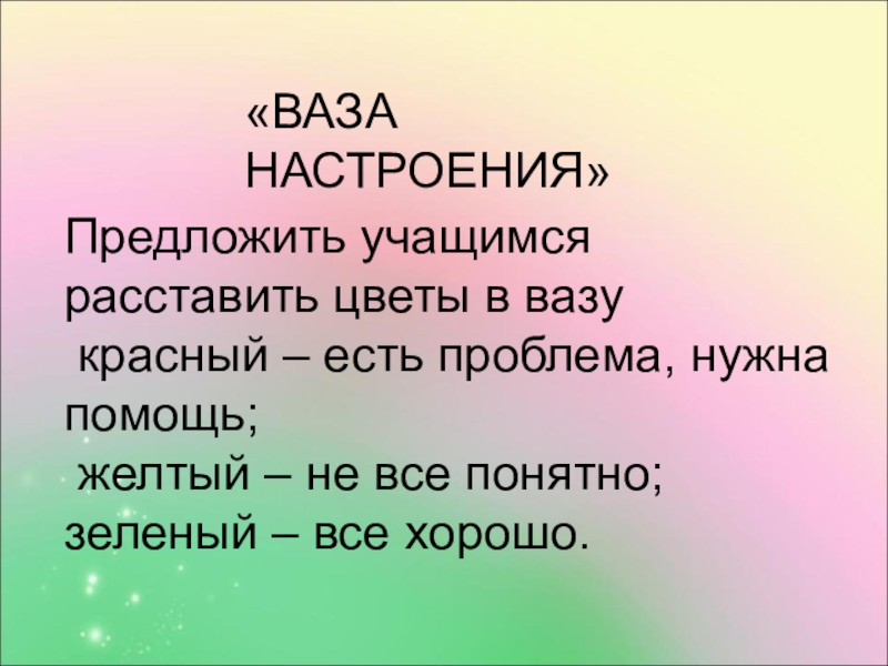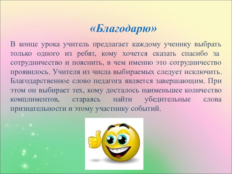 одного из ребят, кому хочется сказать спасибо за сотрудничество и пояснить, в чем именно это сотрудничество проявилось. Учителя из числа выбираемых следует исключить. Благодарственное слово педагога является завершающим. При этом он выбирает тех, кому досталось наименьшее количество комплиментов, стараясь найти убедительные слова признательности и этому участнику событий.