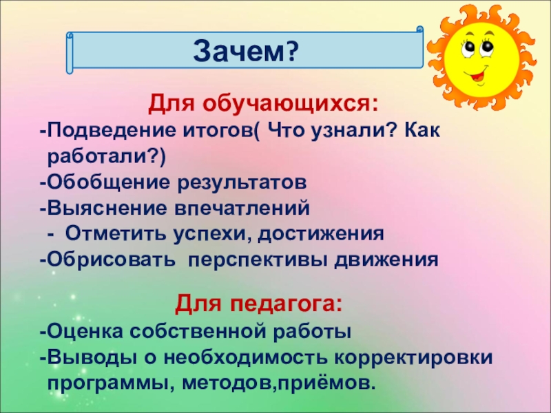 направлена на осознание пройденного пути, на сбор в общую копилку замеченного обдуманного, понятого каждым