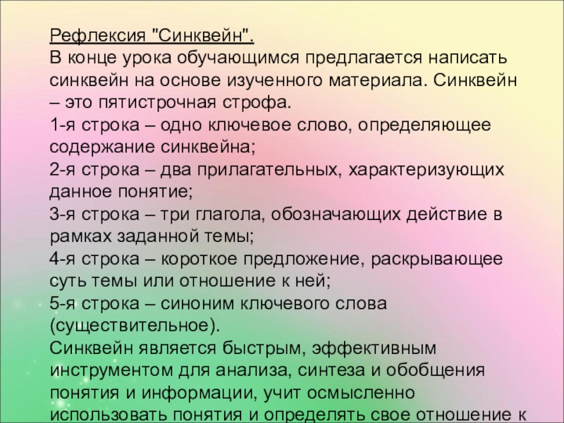 Синквейн является быстрым, эффективным инструментом для анализа, синтеза и обобщения понятия и информации, учит осмысленно использовать понятия и определять свое отношение к рассматриваемой проблеме.