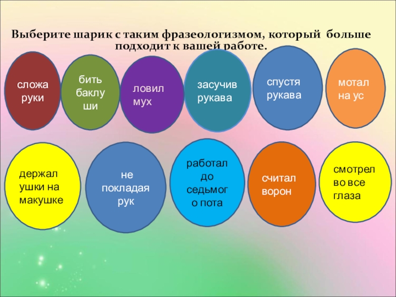 Слайд 58Выберите шарик с таким фразеологизмом, который больше подходит к вашей работе.