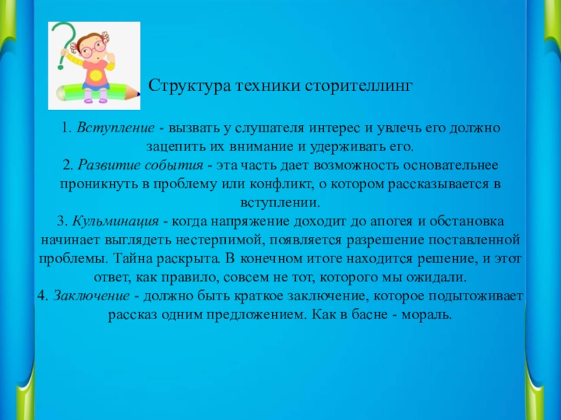 2. Техника сторителлинга имеет форму дискурса, потому что рассказы представляют большой интерес, а также развивают фантазию, логику и повышают культурное образование.