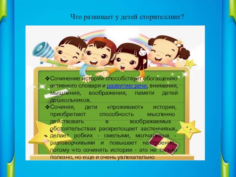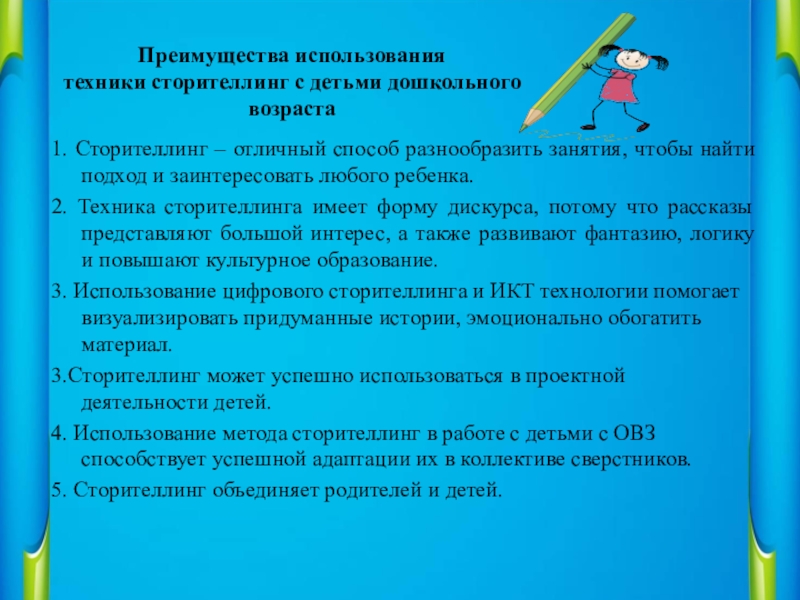 Слайд 7Преимущества использования техники сторителлинг с детьми дошкольного возраста