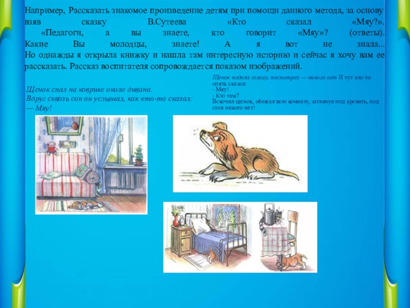 Слайд 12Например, Рассказать знакомое произведение детям при помощи данного метода, за основу