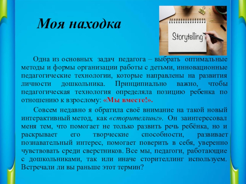 Совсем недавно я обратила своё внимание на такой новый интерактивный метод, как «сторителлинг». Он заинтересовал меня тем, что помогает не только развить речь ребёнка, но и раскрывает его творческие способности, развивает познавательный интерес, помогает поверить в себя, уверенно чувствовать среди сверстников. Все мы, педагоги, работающие с дошкольниками, так или иначе сторителлинг используем. Встречали ли вы раньше этот термин?