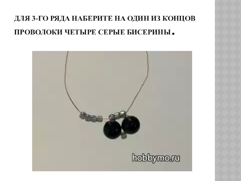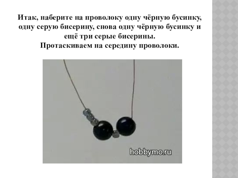 Слайд 3Итак, наберите на проволоку одну чёрную бусинку, одну серую бисерину, снова