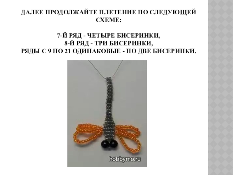 Слайд 15Далее продолжайте плетение пo следующей схеме: 7-й ряд - четыре бисеринки, 8-й ряд