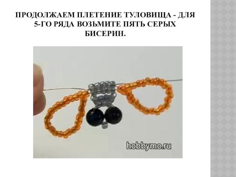 Слайд 11Продолжаeм плетение туловища - для 5-го ряда возьмите пять серых бисерин.