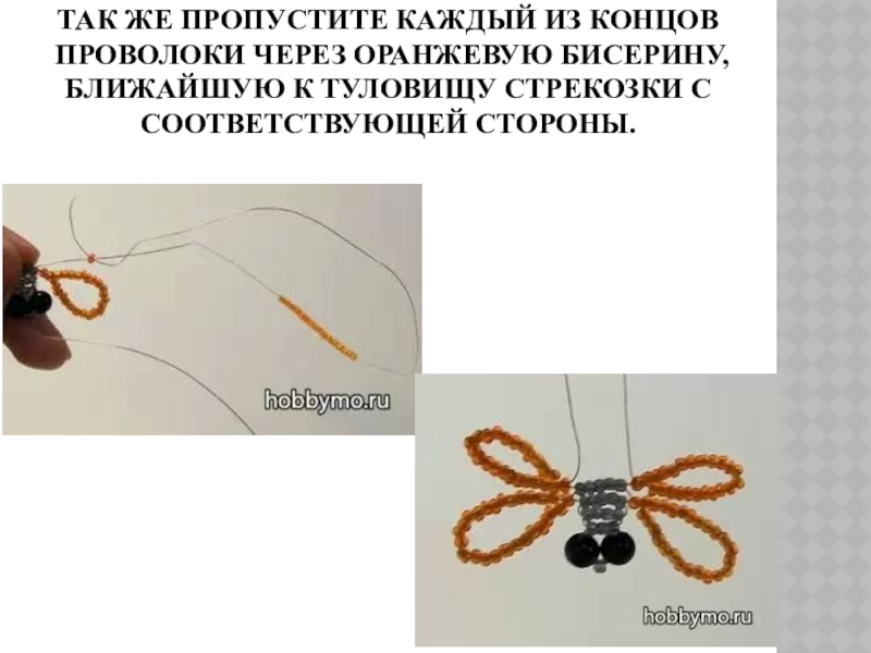 Слайд 13Так же пропустите каждый из концов проволоки через оранжевую бисерину, ближайшую