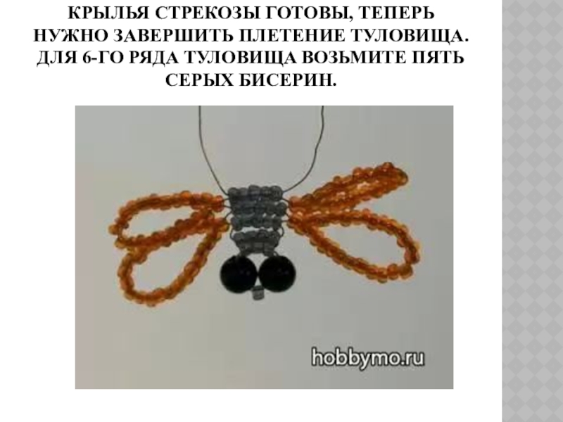 Крылья стрекозы готовы, теперь нужно завершить плетение туловища.  Для 6-го ряда туловищa возьмите пять серых бисерин.