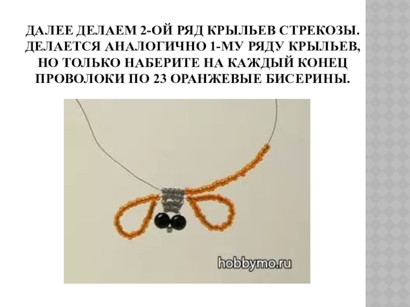 Слайд 8Далее делаем 1-ый ряд крыльев стрекозы. Наберитe на каждый конец проволоки пo