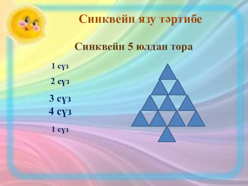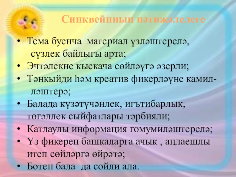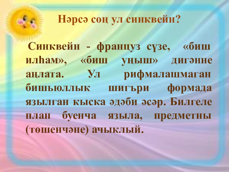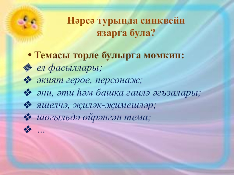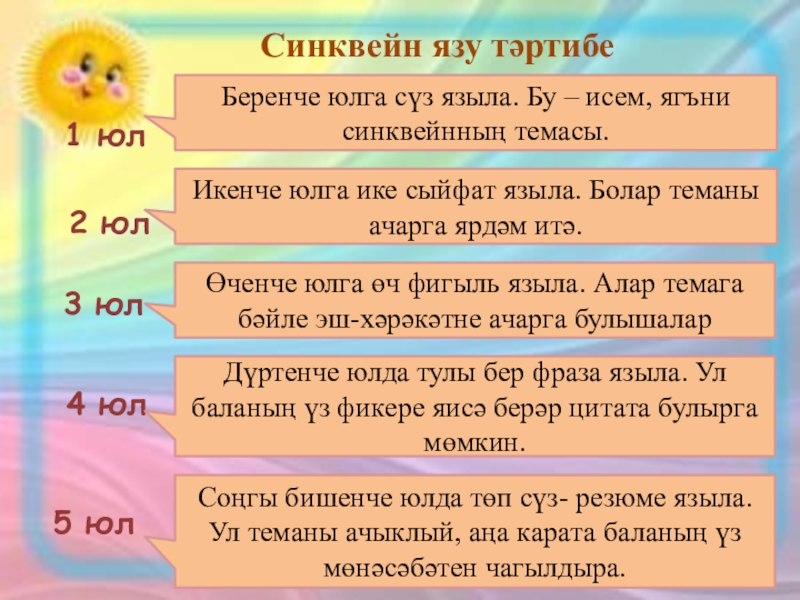 Соңгы бишенче юлда төп сүз- резюме языла. Ул теманы ачыклый, аңа карата баланың үз мөнәсәбәтен чагылдыра.