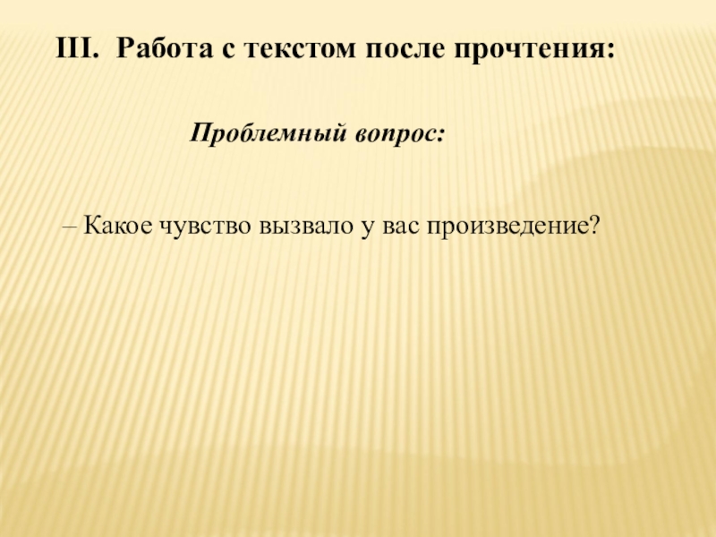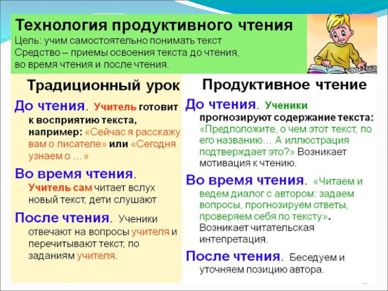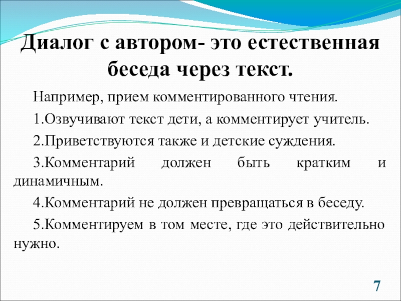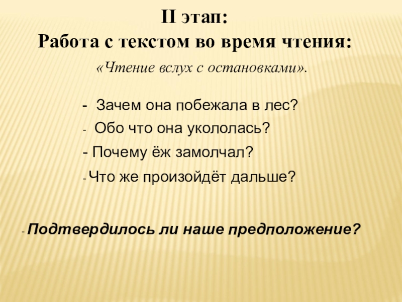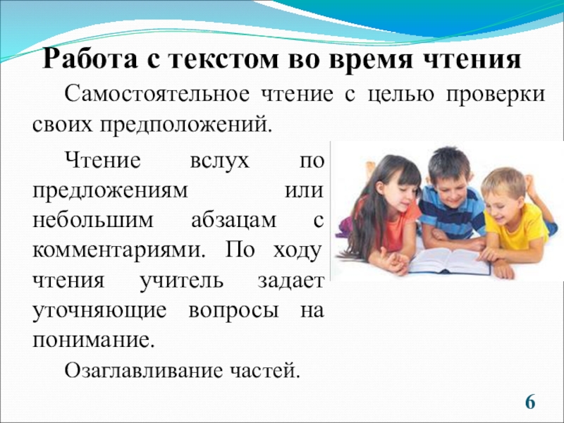 Чтение вслух по предложениям или небольшим абзацам с комментариями. По ходу чтения учитель задает уточняющие вопросы на понимание.