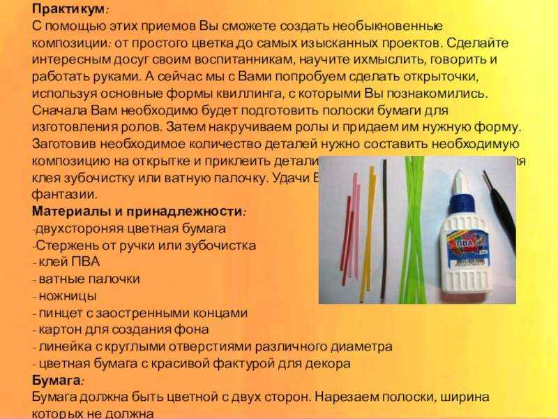 цветка,до самых изысканных проектов. Сделайте интересным досуг своим воспитанникам, научите ихмыслить, говорить и работать руками. А сейчас мы с Вами попробуем сделать открыточки,используя основные формы квиллинга, с которыми Вы познакомились. Сначала Вам необходимо будет подготовить полоски бумаги для изготовления ролов. Затем накручиваем ролы и придаем им нужную форму. Заготовив необходимое количество деталей нужно составить необходимую композицию на открытке и приклеить детали с помощью клея, используя для клея зубочистку или ватную палочку. Удачи Вам, вдохновения и полета фантазии.