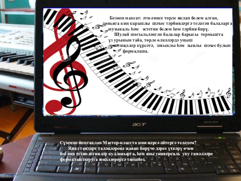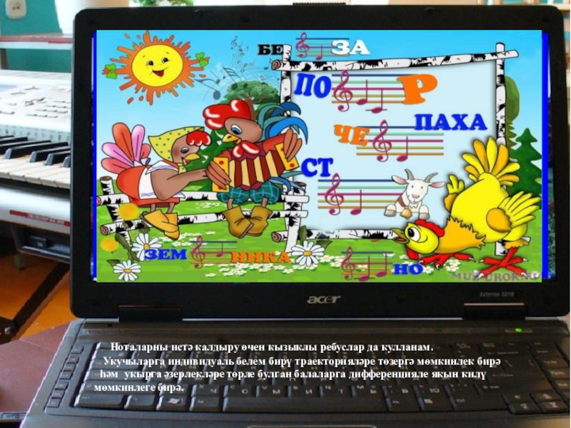Тагын бер Мәктәпләрдә музыка уен кораллары юк, баланың ноталарны үзе басып карыйсы килә. Бу проблеманы чишүдә методистыбыз Ләйсән Марсовна үзенең файдалы, кызыклы киңәшләрен бирде. Аларны Сезгә дә тәкъдим итәсем килә.