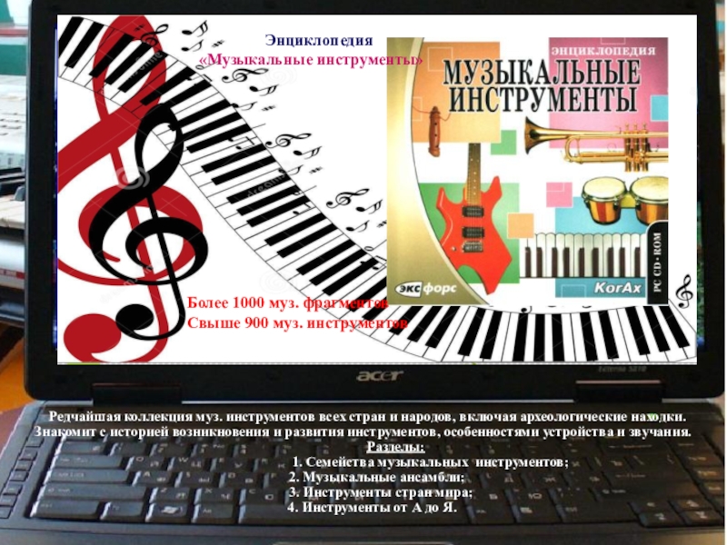 -Дает описание различных типов муз. инструментов (старинных, классических,
