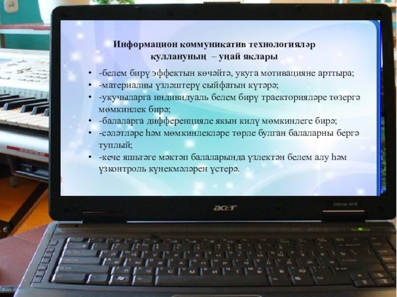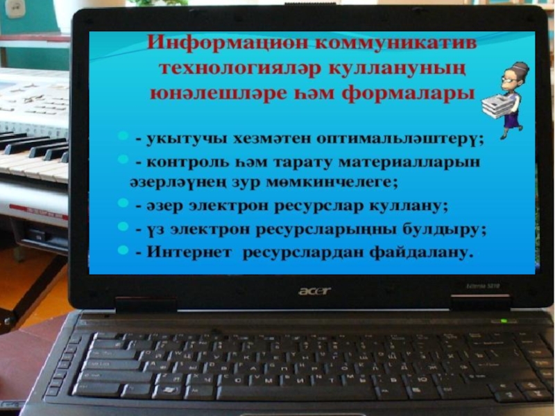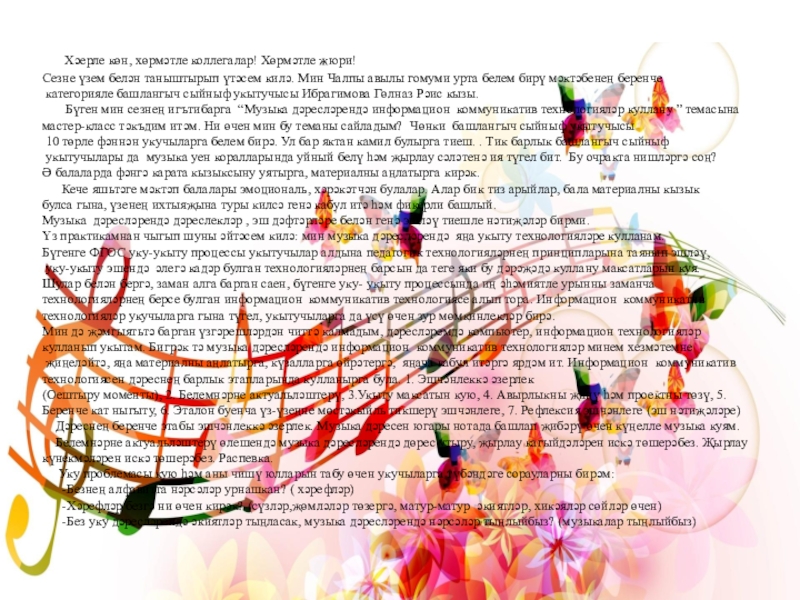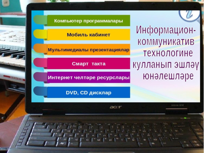 кулланып укытам. Бигрәк тә музыка дәресләрендә информацион коммуникатив технологияләр минем хезмәтемне