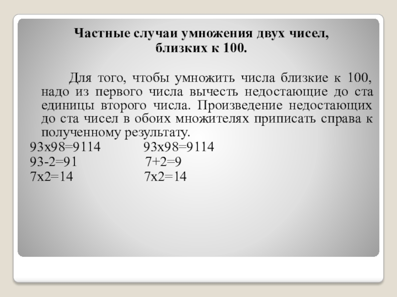Для того, чтобы умножить числа близкие к 100, надо из первого числа вычесть недостающие до ста единицы второго числа. Произведение недостающих до ста чисел в обоих множителях приписать справа к полученному результату.