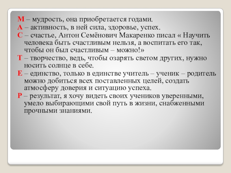 Р – результат, я хочу видеть своих учеников уверенными, умело выбирающими свой путь в жизни, снабженными прочными знаниями.