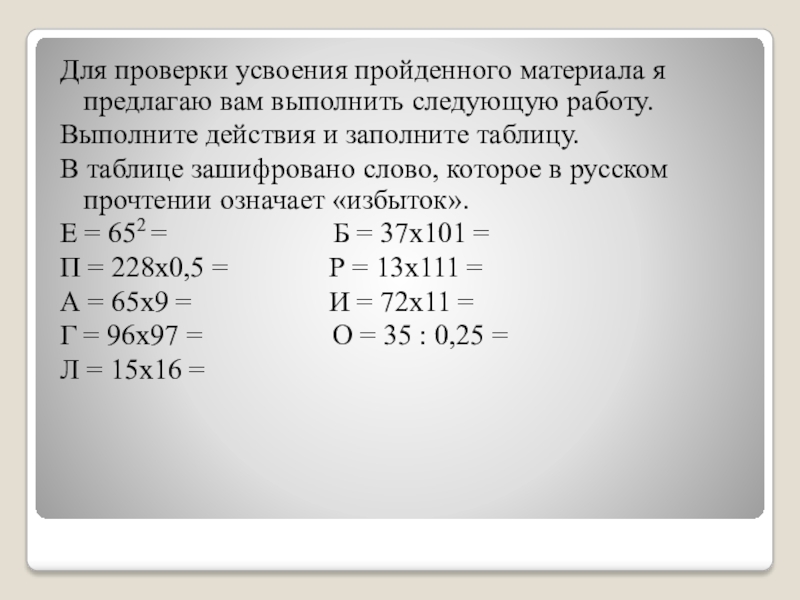 Слайд 14Для проверки усвоения пройденного материала я предлагаю вам выполнить следующую работу.