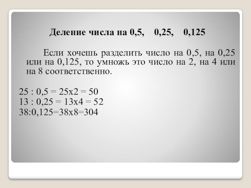 Если хочешь разделить число на 0,5, на 0,25 или на 0,125, то умножь это число на 2, на 4 или на 8 соответственно.