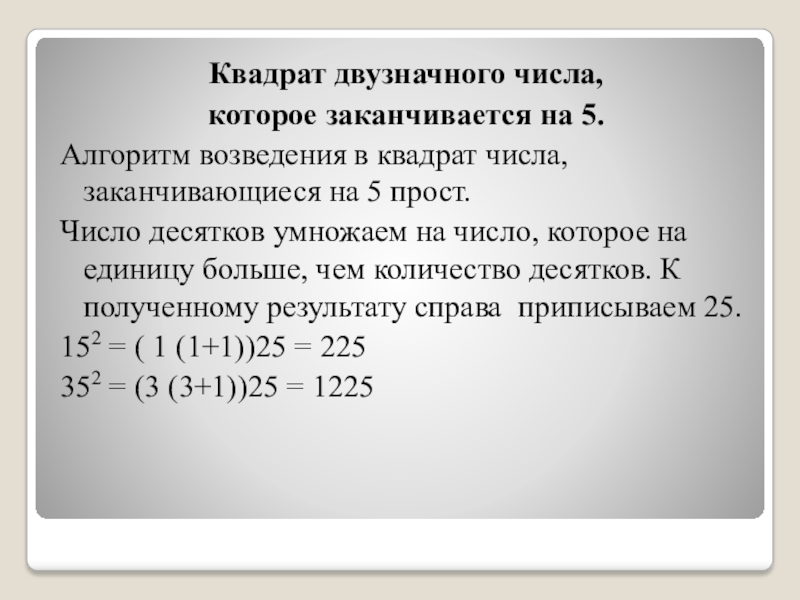 Число десятков умножаем на число, которое на единицу больше, чем количество десятков. К полученному результату справа приписываем 25.