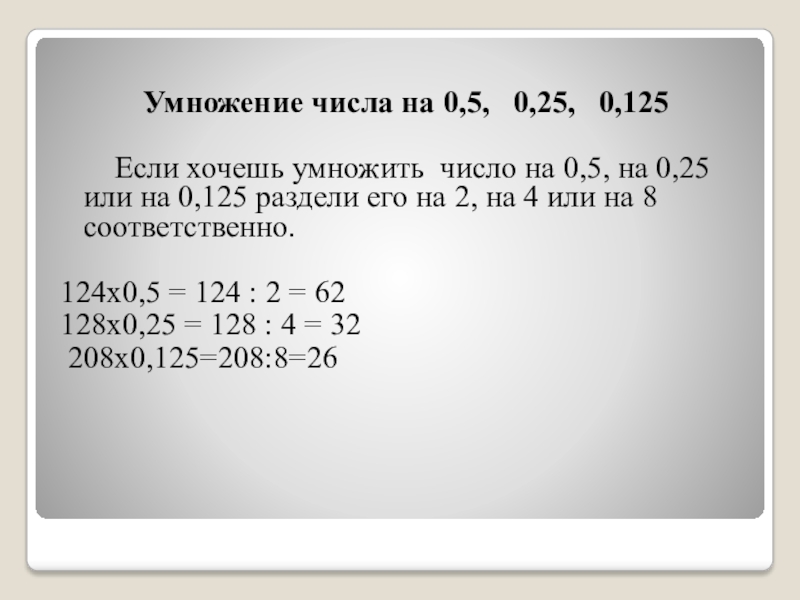 Если хочешь умножить число на 0,5, на 0,25 или на 0,125 раздели его на 2, на 4 или на 8 соответственно.