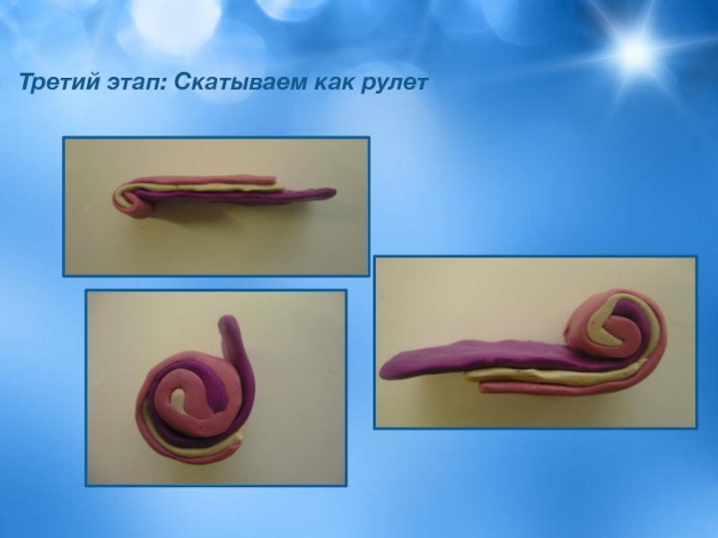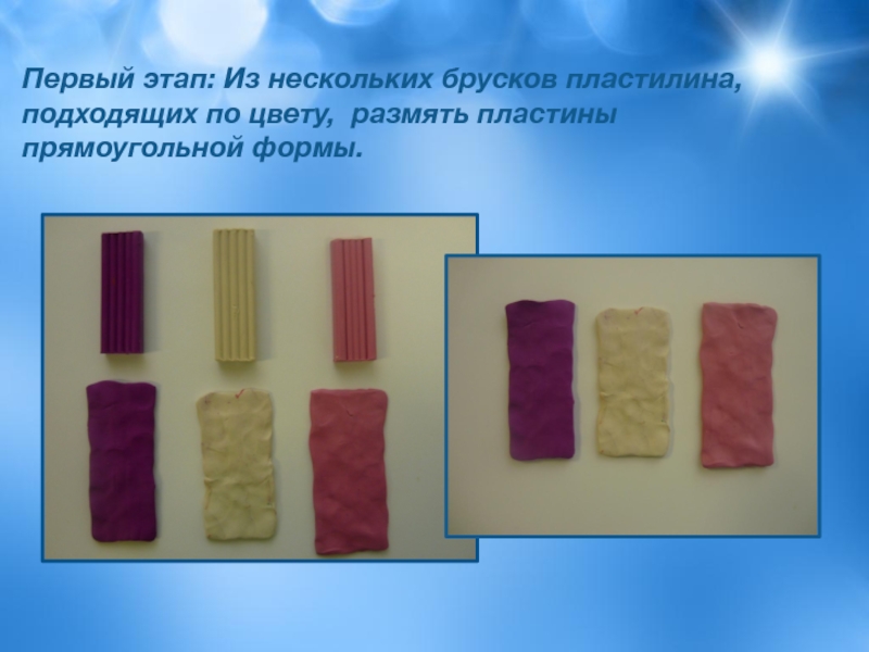 Слайд 2Первый этап: Из нескольких брусков пластилина, подходящих по цвету, размять пластины