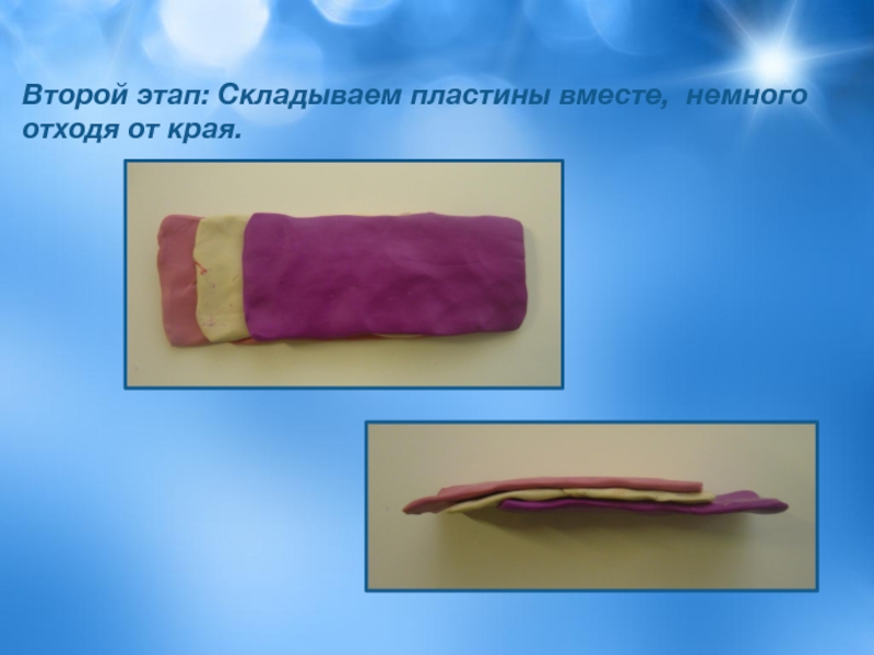 Слайд 3Второй этап: Складываем пластины вместе, немного отходя от края.