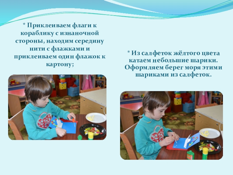* Из салфеток жёлтого цвета катаем небольшие шарики. Оформляем берег моря этими шариками из салфеток.