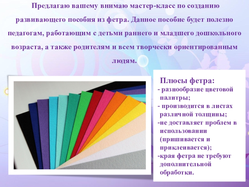 Фетр - это двусторонний материал, изготовленный из тонкой шерсти с добавкой пуха, а в настоящее время – вискозы и синтетики.