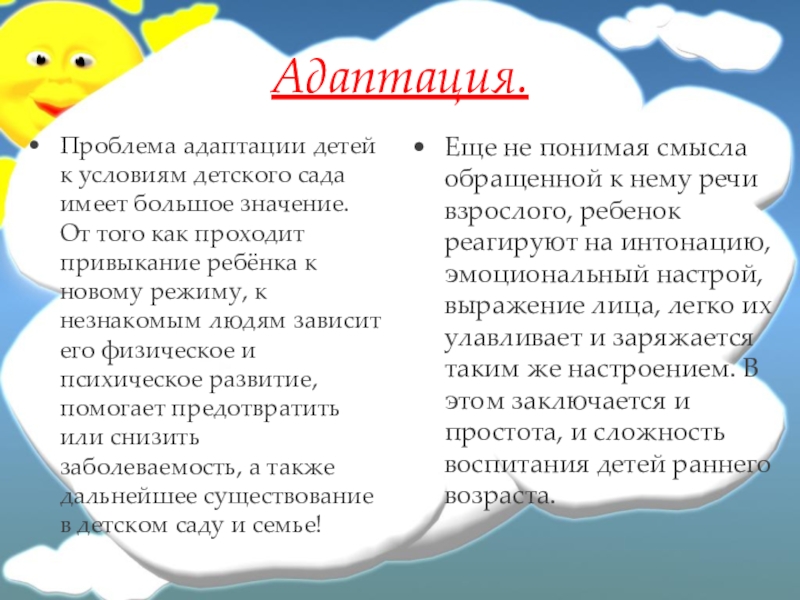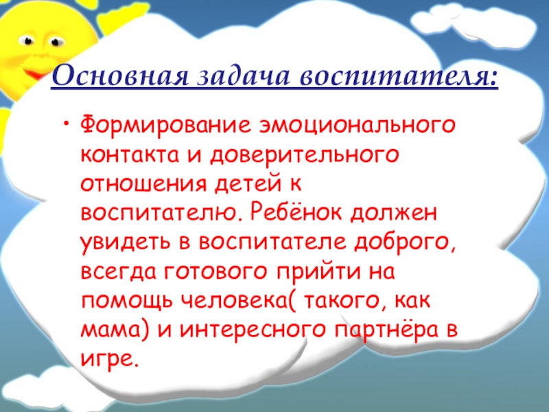 Еще не понимая смысла обращенной к нему речи взрослого, ребенок реагируют на интонацию, эмоциональный настрой, выражение лица, легко их улавливает и заряжается таким же настроением. В этом заключается и простота, и сложность воспитания детей раннего возраста.