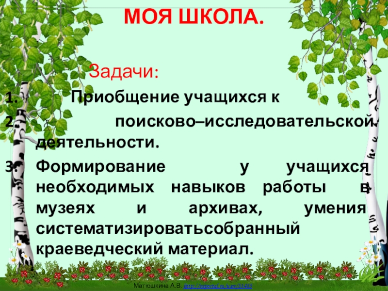 Формирование у учащихся необходимых навыков работы в музеях и архивах, умения систематизировать собранный краеведческий материал.