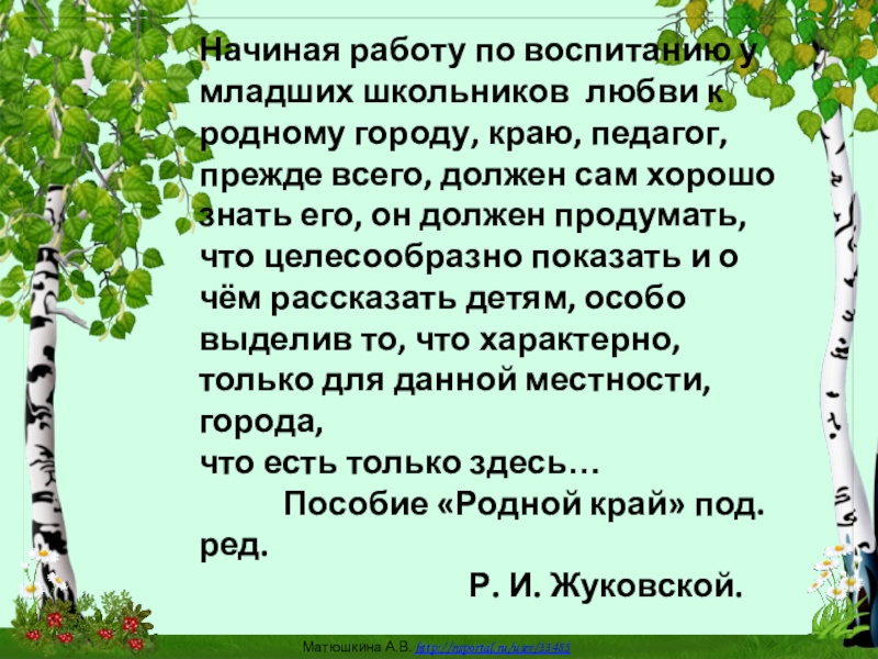 краю, педагог, прежде всего, должен сам хорошо знать его, он должен продумать, что целесообразно показать и о чём рассказать детям, особо выделив то, что характерно, только для данной местности, города,