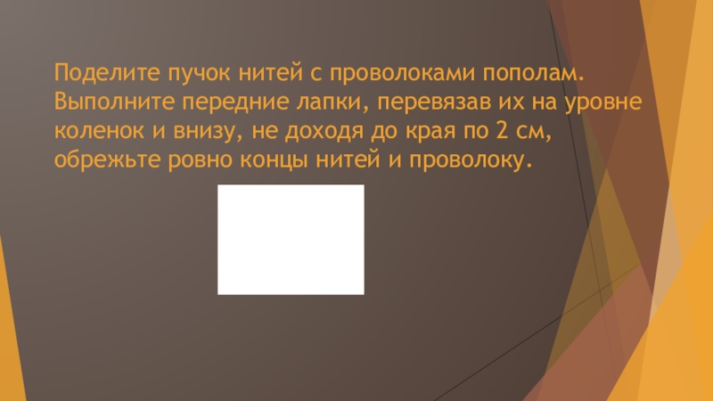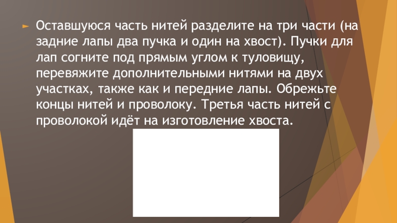 Слайд 12Оставшуюся часть нитей разделите на три части (на задние лапы два