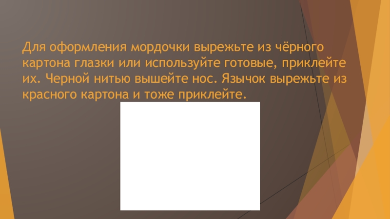 Слайд 13Для оформления мордочки вырежьте из чёрного картона глазки или используйте готовые,