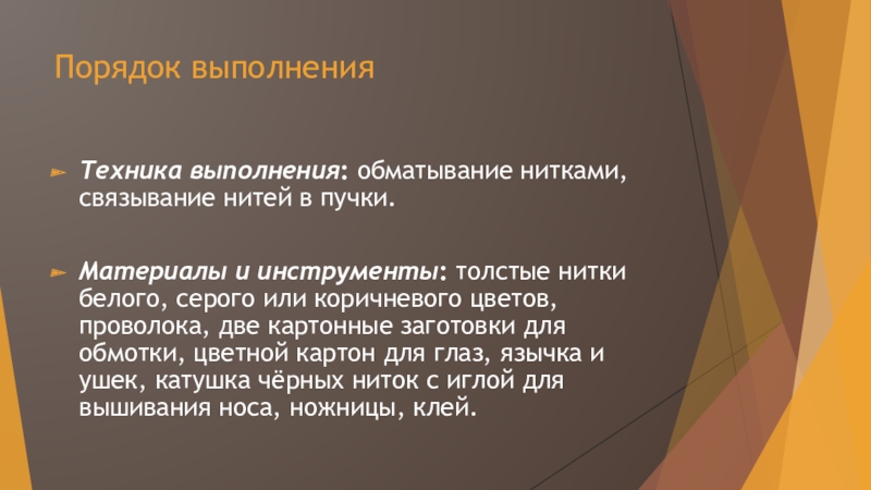 Порядок выполненияТехника выполнения: обматывание нитками, связывание нитей в пучки. Материалы и инструменты: толстые нитки белого, серого или коричневого