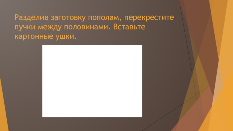 Слайд 7Разделив заготовку пополам, перекрестите пучки между половинами. Вставьте картонные ушки.