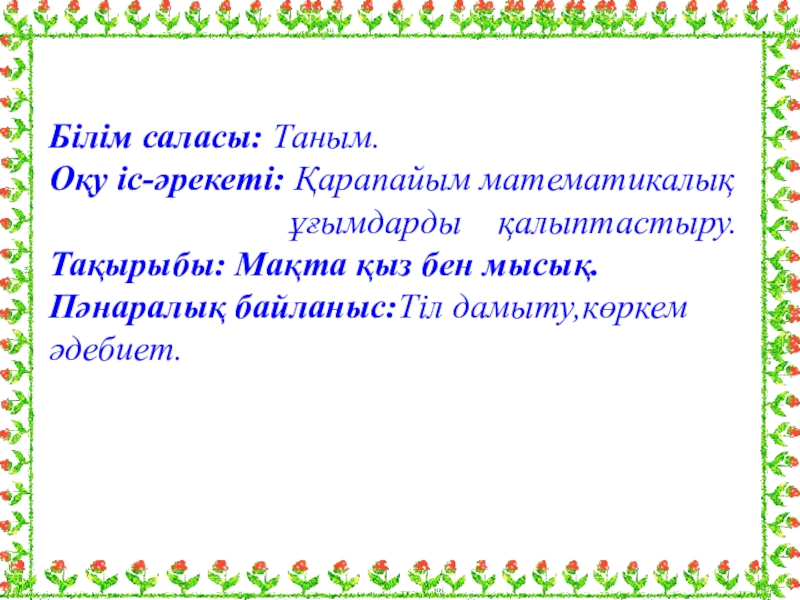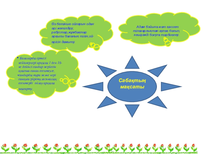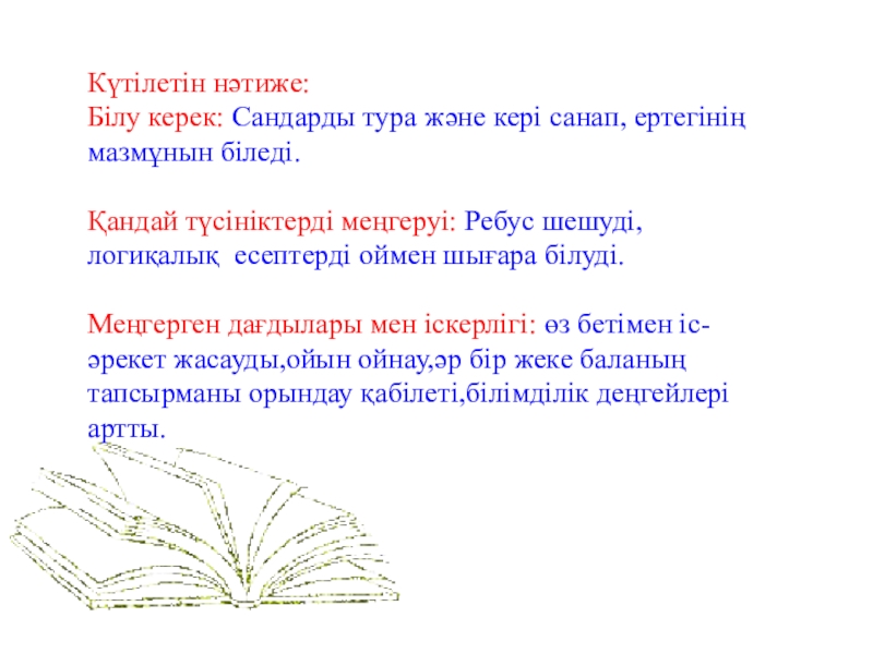 сандарды тура және кері санауға үйрету,логикалық есептерді ойлау арқылы шығарту.