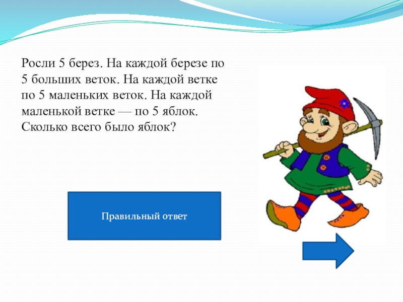 Росли 5 берез. На каждой березе по 5 больших веток. На каждой ветке по 5 маленьких веток. На каждой маленькой ветке — по 5 яблок. Сколько всего было яблок?