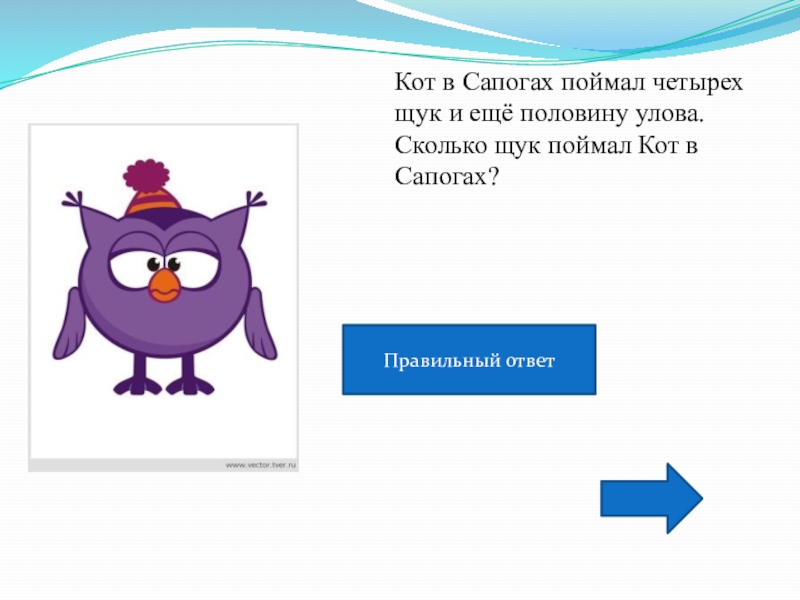 Кот в Сапогах поймал четырех щук и ещё половину улова. Сколько щук поймал Кот в Сапогах?