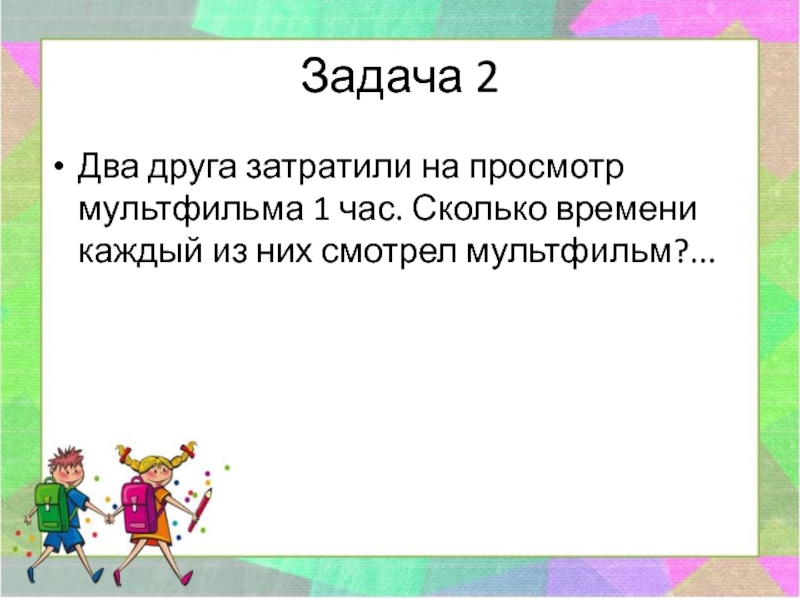 Задача 2Два друга затратили на просмотр мультфильма 1 час. Сколько времени каждый из них смотрел мультфильм?...