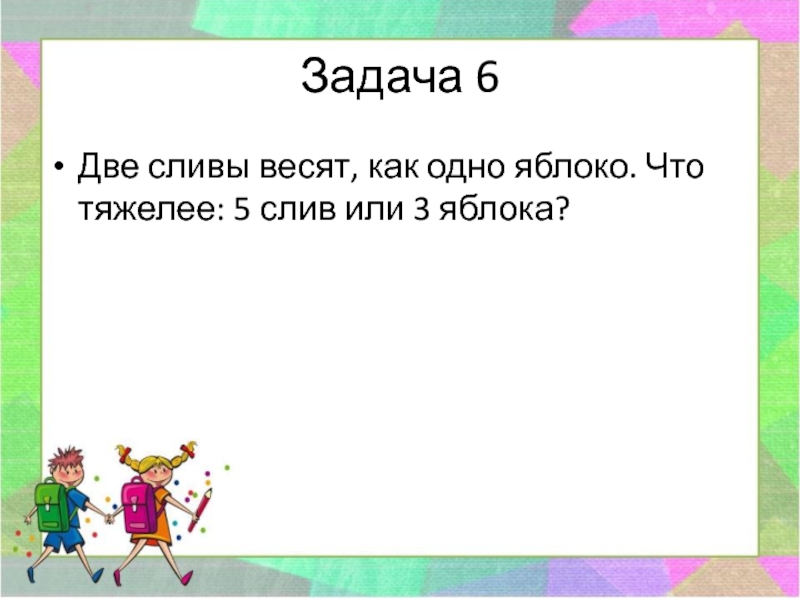 Задача 6Две сливы весят, как одно яблоко. Что тяжелее: 5 слив или 3 яблока?